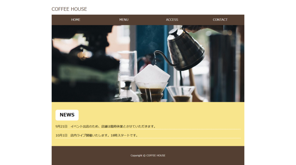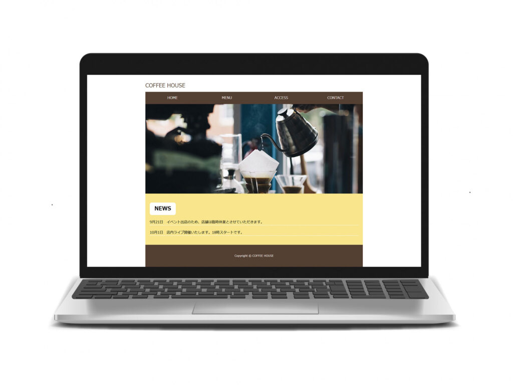 大阪堺筋本町の隠れ家的カフェ「COFFEE HOUSE」 ■coffee-house ■サイト概要:大阪堺筋本町の隠れ家的カフェ「COFFEE HOUSE」のサイト ■制作時期:2024年11月 5日間 職業訓練校の授業で制作しました ■使用ツール:HTML, CSS 2025年3月1日 投稿先 web site ← 過去の投稿へ 次の投稿へ →